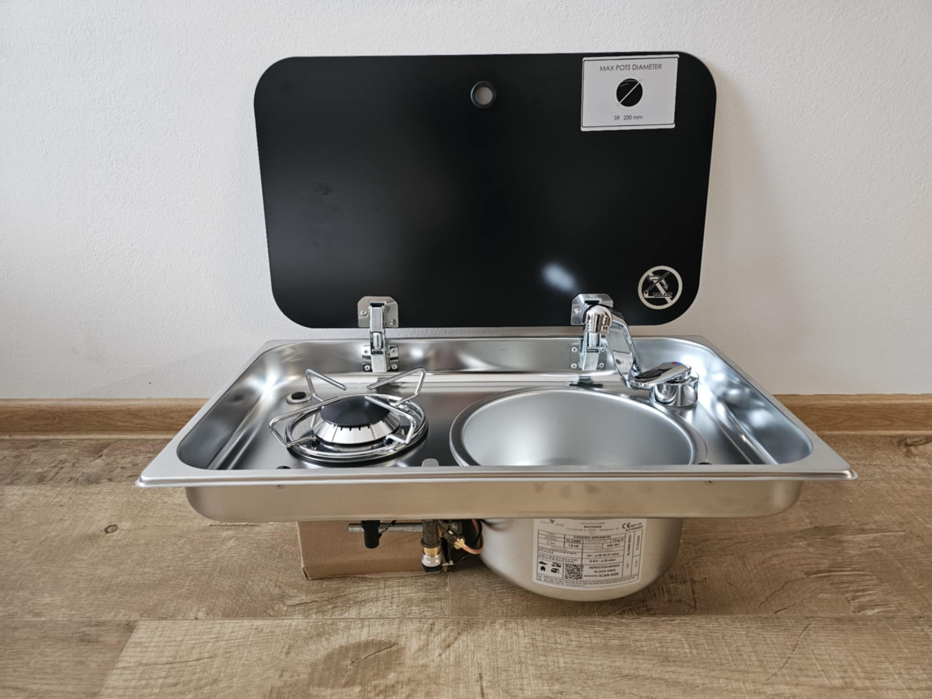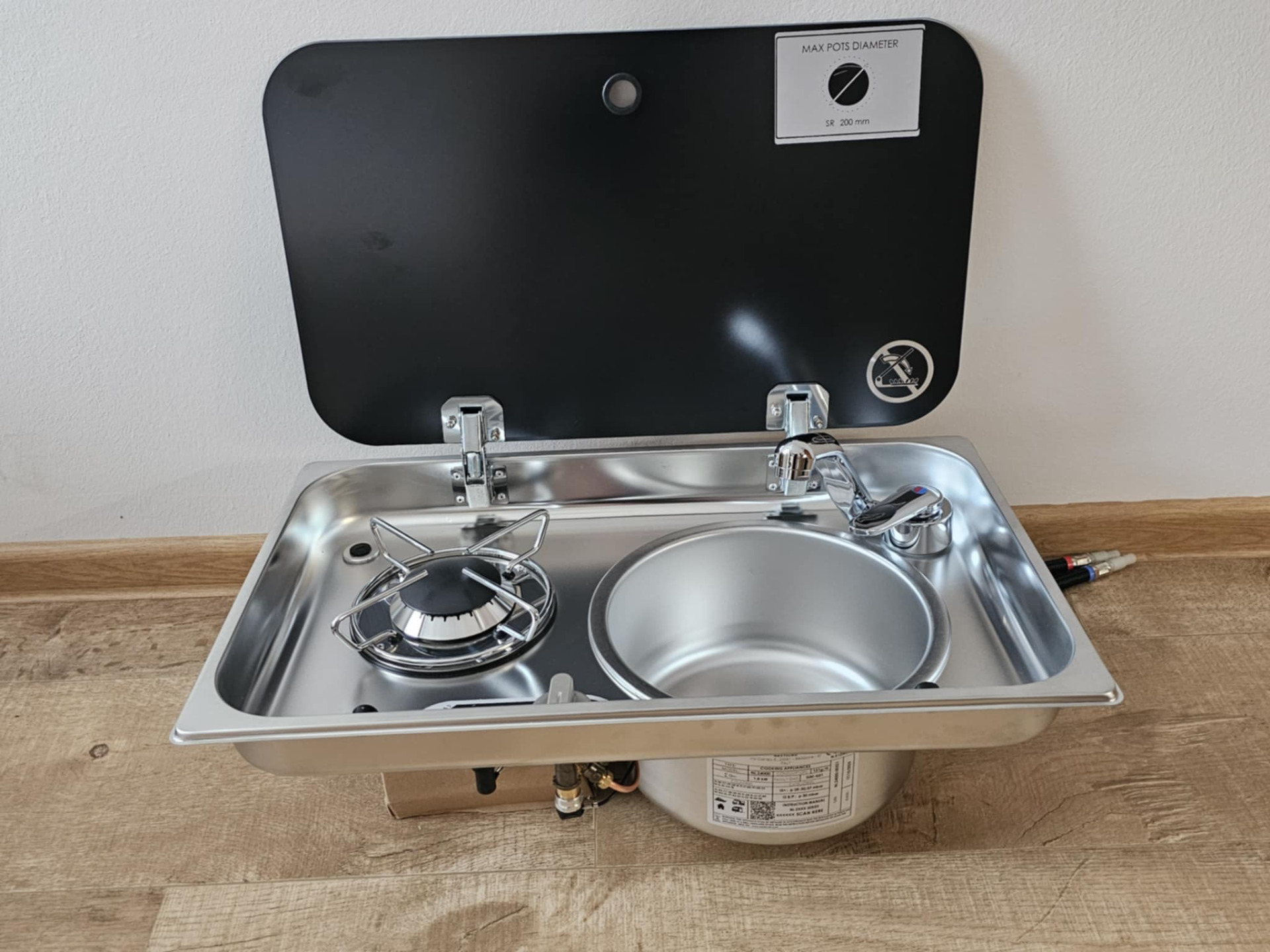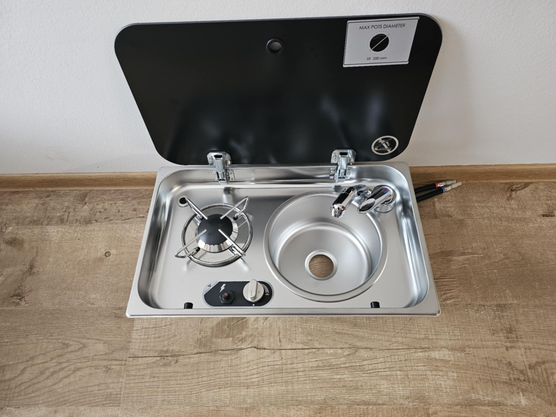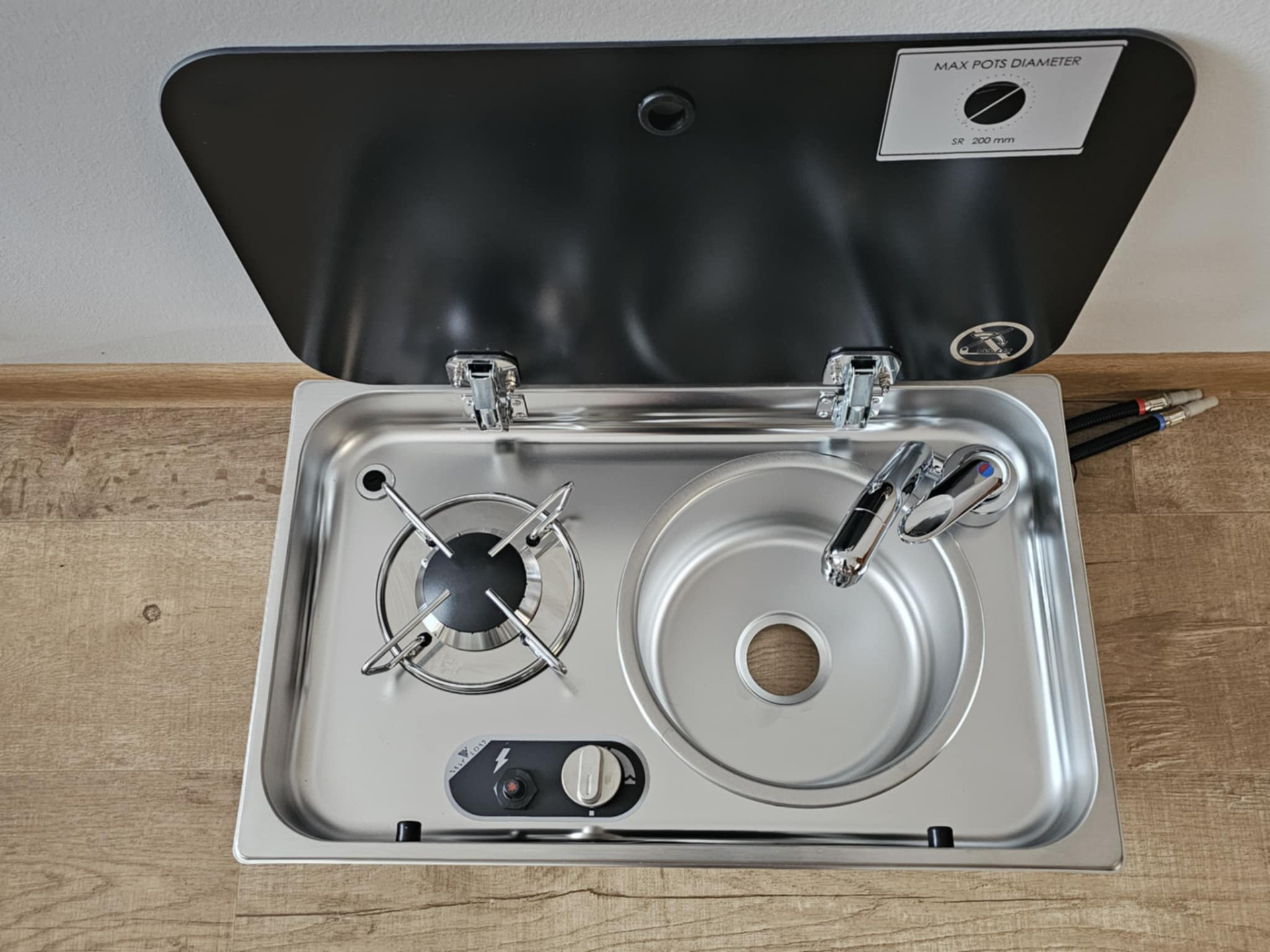 Nerezová kuchyňská kombinace (KK) =varná deska Caravanman s dřezem a skleněným víkem =určena pro použití v obytném voze